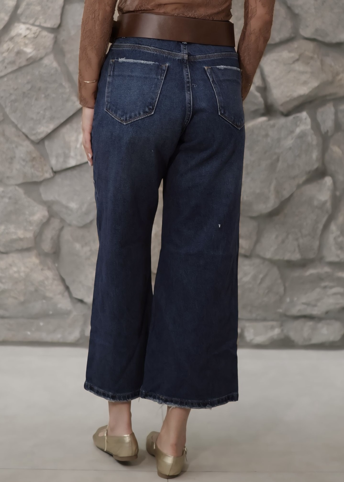 A calça margot é a tradução perfeita do jeans sofisticado. O tom de azul profundo do denim reforça o caráter clássico e atemporal, ideal para composições que transitam do casual refinado ao look urbano chic.