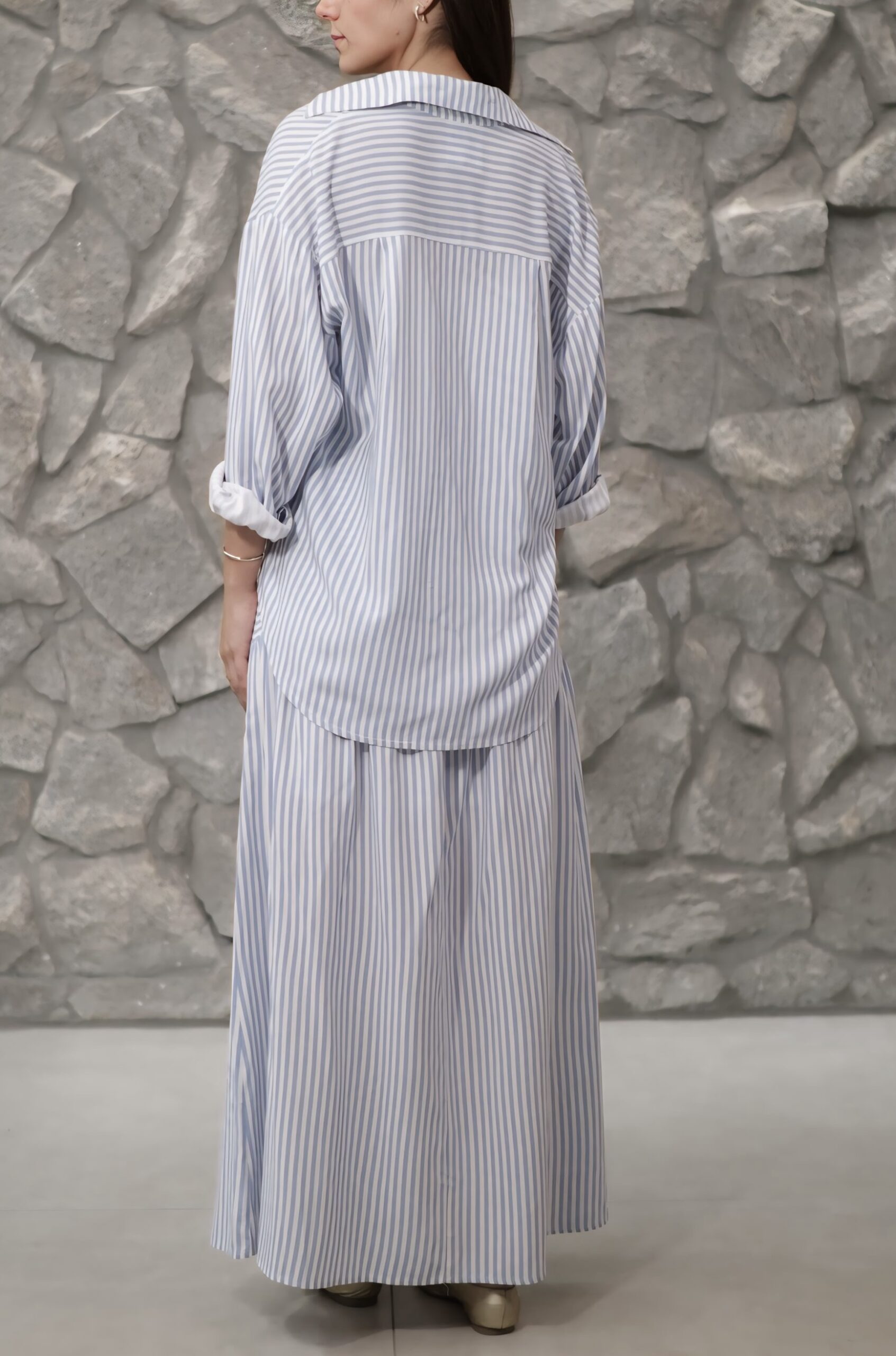 Composto por camisa de botões e saia midi listrada, o conjunto é ideal para quem busca um visual moderno e atemporal. As listras trazem um ar leve e natural, perfeito para dias ensolarados, encontros casuais ou momentos de descontração com estilo.