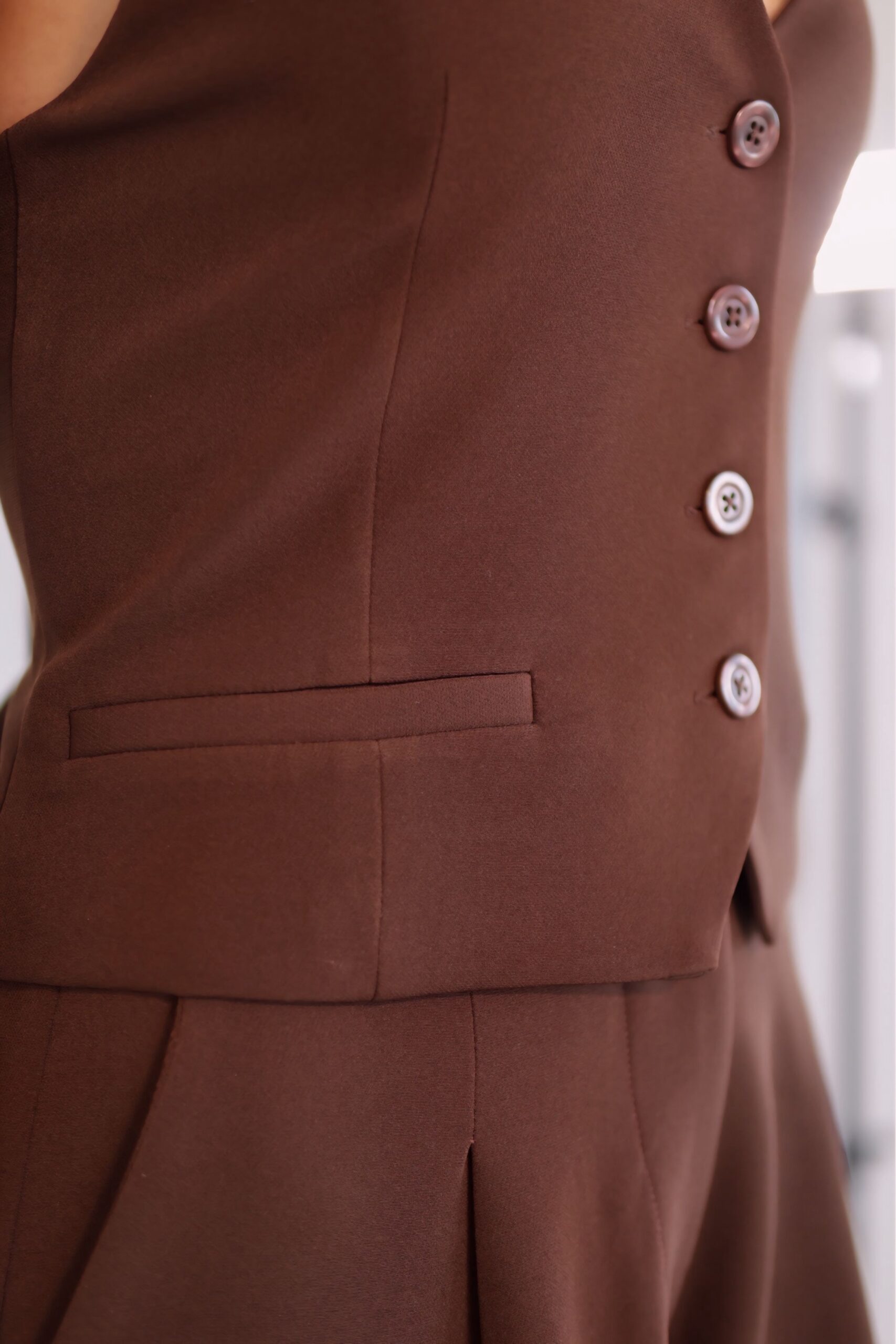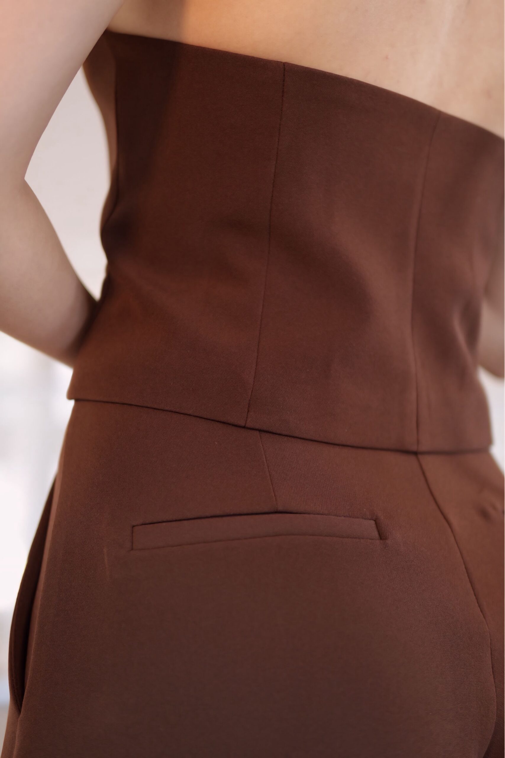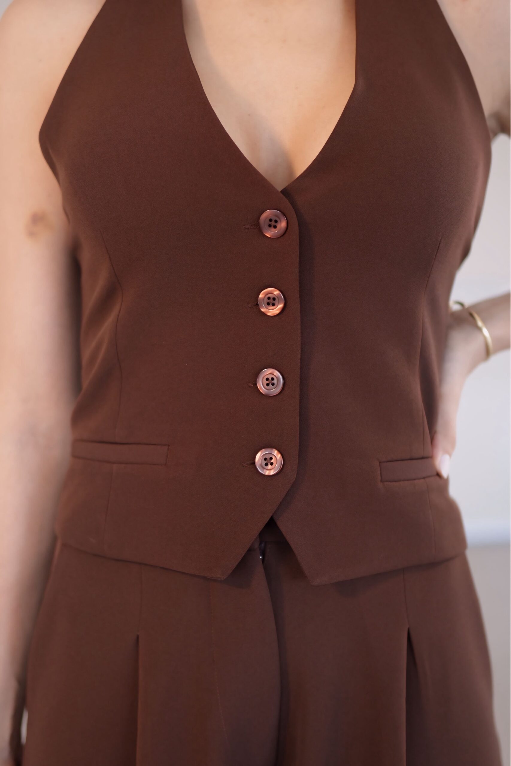 O colete estruturado com decote profundo transmite elegância, enquanto a calça de corte fluido e cintura marcada traz movimento e leveza ao visual. A combinação cria uma silhueta alongada e poderosa, ideal para quem busca presença e elegância sem abrir mão do conforto.