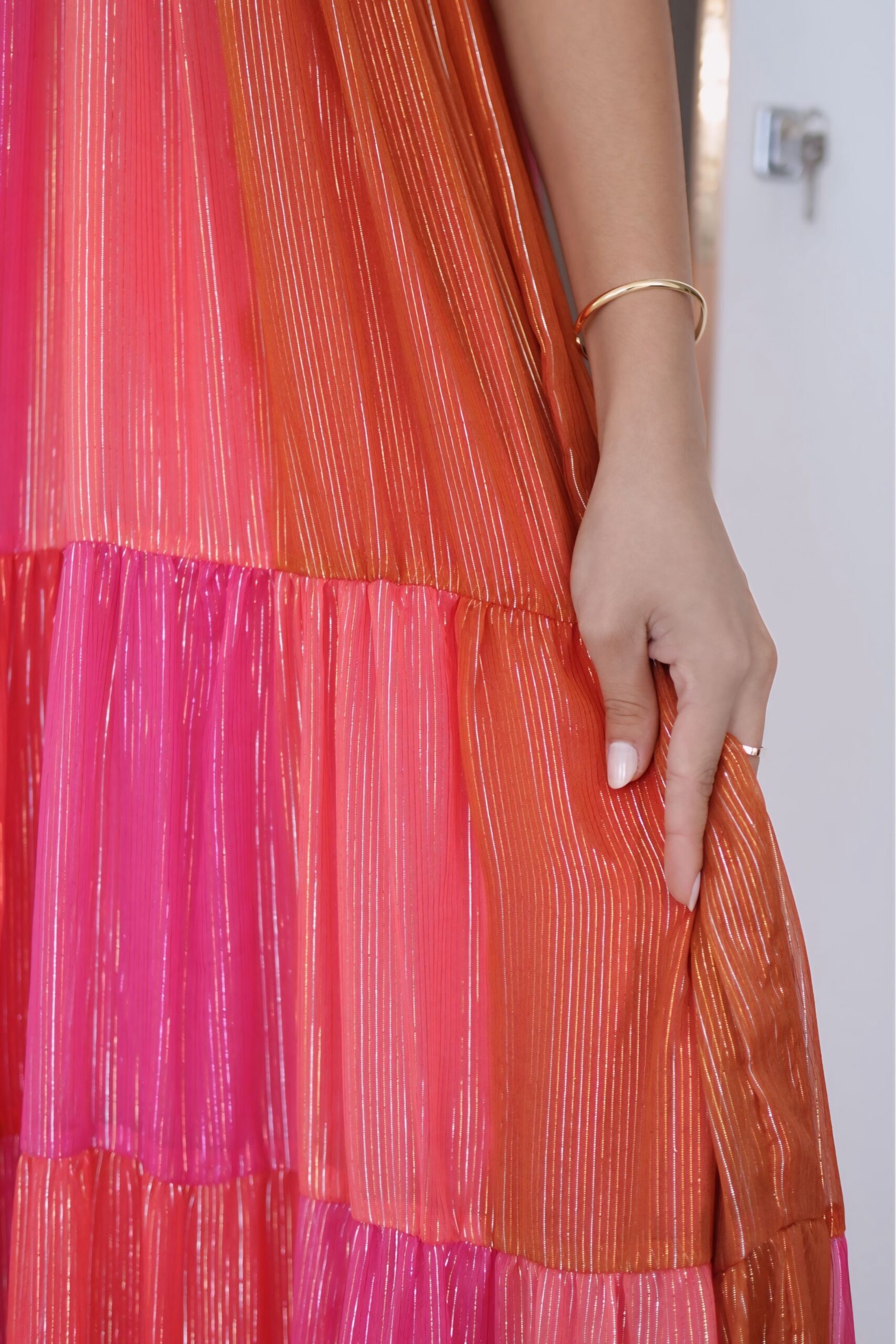 Com um degradê deslumbrante entre tons de rosa, coral e dourado queimado, ele reflete o brilho suave e encantador do nascer do sol, tornando cada movimento um espetáculo de luz e elegância.
