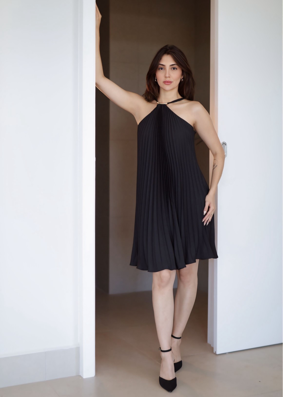 Elegância em sua forma mais pura. O Vestido eclipse é uma peça clássica e atemporal que une fluidez, movimento e sofisticação. Seu design plissado cria um caimento leve e impecável, enquanto o detalhe metálico no decote adiciona um toque de brilho sutil e refinado.