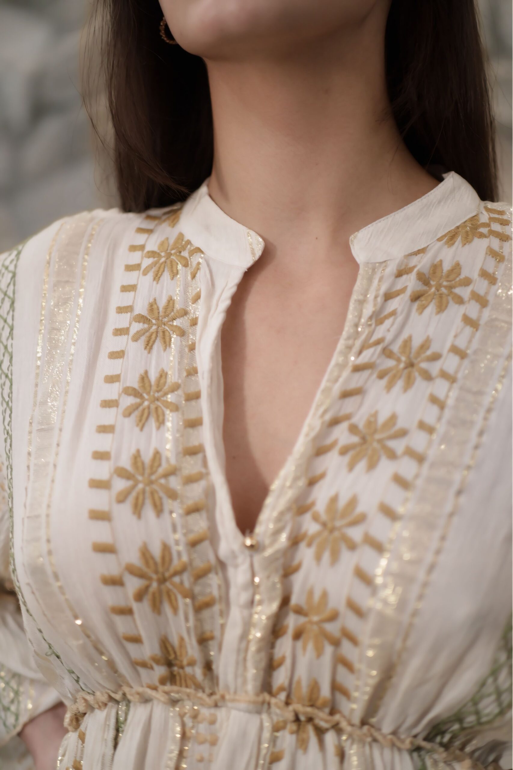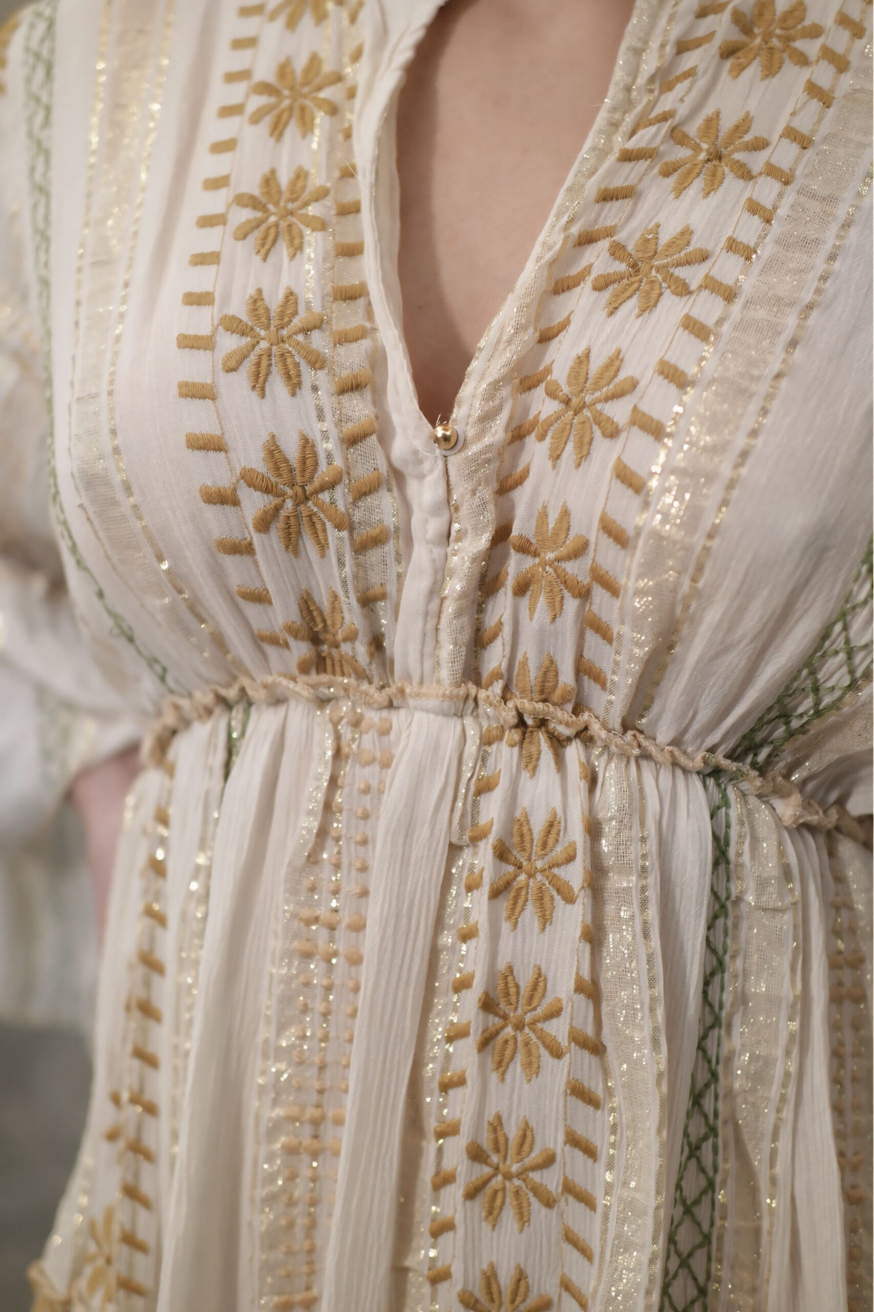 Com bordados minuciosos em tons dourados e verde oliva, ele exala sofisticação e leveza em cada detalhe.